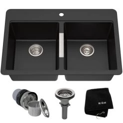 - Double bowl (50/50 split) 33″ sink with traditional rounded corners