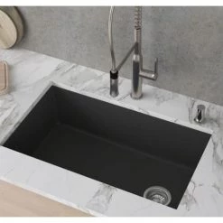 Handcrafted in Italy, the Bellucci™ Workstation redefines granite sinks with enhanced functionality and modern style. An integrated ledge supports custom accessories that slide across the sink, streamlining your kitchen workflow from meal-prep to clean-up. The sink comes with a chef’s kit that includes a multipurpose roll-up drying rack and heavy-duty cutting board that allow you to work right over the sink without taking up counter space. The high-performance sink is made from an advanced quartz composite material with the look and feel of real stone. A Kraus Healthy Home Product, this cutting-edge sink is enriched with naturally antimicrobial silver ions that repel bacteria for a cleaner and healthier kitchen. Undermount installation creates a seamless transition between sink and countertop, with no exposed mounting deck to trap food and debris. The large single bowl with rear offset drain maximizes usable workspace in the sink and easily accommodates for large pots, baking sheets, and stacks of dishes. Engineered for optimal draining, the gently sloped bottom prevents water from pooling in the sink. Extra-tough construction offers unparalleled resistance to impact and thermal shock, with heat resistance up to 500°F. Designed with rounded corners and a non-porous surface, this sink is stain resistant and easy to clean. The vivid fade-resistant color is enhanced with UV protection to prevent discoloration over time. Premium stainless steel drain assembly is included