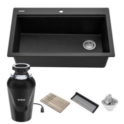 Handcrafted in Italy, Bellucci sinks enhance the functionality of your kitchen with captivating style. The workstation design features an integrated ledge that serves as a platform for custom-fit accessories that slide across the sink, streamlining your kitchen workflow from meal-prep to clean-up. The sink comes with accessories, including a multifunctional roll-up dish drying rack and heavy-duty composite cutting board as well as the stainless steel drain assembly. A rear off-set drain and easy-to-clean tight-radius corners create a sleek contemporary appearance and maximize usable space in the sink bowl. This kit also includes the Kraus WasteGuard continuous feed garbage disposal for kitchen sinks. Featuring a MagnaGrind 3800 RPM 3/4 horsepower permanent-magnet motor, this premium disposal provides instant power, ensuring faster operation than traditional induction motors for reliable grinding of the toughest food scraps. An included stopper allows you to fill up the sink bowl for soaking dishes, with an extended tailpiece that doubles as a plunger to safely push stubborn food scraps into the disposal. Comes with a complete garbage disposal install kit, including power cord and flange.