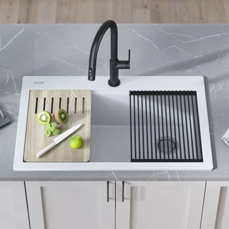 Handcrafted in Italy, Bellucci sinks enhance the functionality of your kitchen with captivating style. The workstation design features an integrated ledge that serves as a platform for custom-fit accessories that slide across the sink, streamlining your kitchen workflow from meal-prep to clean-up. The sink comes with accessories, including a multifunctional roll-up dish drying rack and heavy-duty composite cutting board as well as the stainless steel drain assembly. A rear off-set drain and easy-to-clean tight-radius corners create a sleek contemporary appearance and maximize usable space in the sink bowl. This kit also includes the Kraus WasteGuard continuous feed garbage disposal for kitchen sinks. Featuring a MagnaGrind 3800 RPM 3/4 horsepower permanent-magnet motor, this premium disposal provides instant power, ensuring faster operation than traditional induction motors for reliable grinding of the toughest food scraps. An included stopper allows you to fill up the sink bowl for soaking dishes, with an extended tailpiece that doubles as a plunger to safely push stubborn food scraps into the disposal. Comes with a complete garbage disposal install kit, including power cord and flange.