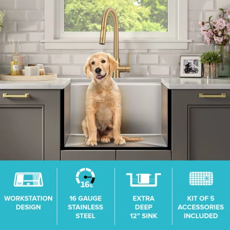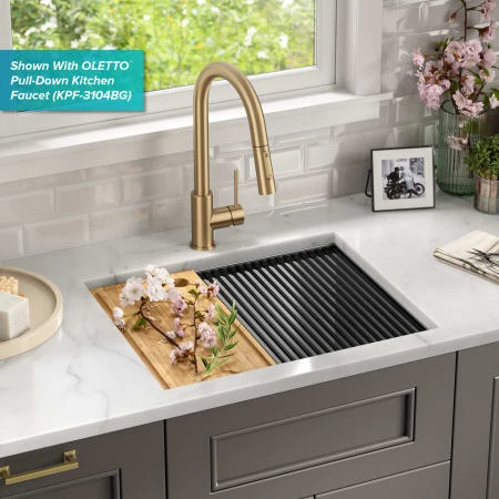 Transform the way you tackle messy tasks with a Kraus Kore workstation laundry utility sink. Ideal for any mud room, workshop, or laundry room, this sink is engineered with an integrated ledge to support sliding accessories, creating a multifunctional workspace to streamline workflow when it’s time to roll up your sleeves. The kit includes a heavy-duty cutting board that provides additional workspace, while the roll-up drying rack makes a perfect place for drying items over the sink. Featuring a 12” deep single bowl, this sink is large enough to handle the toughest jobs, including soaking laundry, watering plants, and even bathing the dog! Undermount installation creates a seamless transition between sink and countertop with no exposed mounting deck to trap dirt, with tight-radius corners for a clean modern look. Made with Kraus TRU16 – the thickest 16 gauge stainless steel for maximum durability and NoiseDefend sound dampening pads to absorb noise and vibration for an ultra-quiet experience. Wear-resistant finish is easy to clean and not prone to corrosion, while rounded corners on the bottom of the sink reduce buildup over time. Channel grooves and a sloped bottom improve drainage, with a rear center set drain for more storage space below the sink. The installation-ready sink comes with a protective stainless steel bottom grid and drain assembly with matching cover for a clean look.