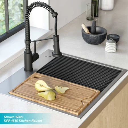 Do more with Kore – The ultimate sink for the modern home chef. Inspired by professional kitchens, the Kore Workstation Series instantly transforms your kitchen sink into a full-service prep station designed for ultimate convenience and entertaining in style. A versatile dual-mount design allows you to install this sink as a drop-in with any type of kitchen counter, with an extra-thick 4mm deck that sits flat against the countertop for a perfectly finished look. Packed with premium accessories such as the multi-purpose dish drying rack and bamboo cutting board, the ultra-functional design of the integrated ledge system allows you to wash and dry, or chop and slice without losing an inch of counter space. For unbeatable value, the set includes a stainless steel bottom grid that protects the sink surface and keeps dishes elevated for optimal draining, a drain assembly, and a decorative drain cover that creates a clean seamless look. Take the functionality of your kitchen sink to a whole new level with the culinary-inspired design of the Kore Workstation Series, and experience the Kraus difference.