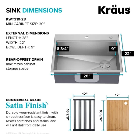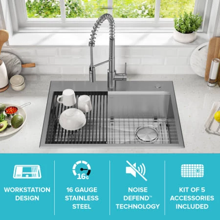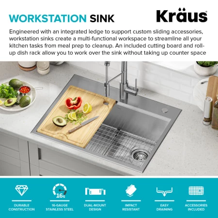 Cook, serve, and entertain in style with Kraus Kore workstation sinks. Engineered with an integrated ledge to support custom sliding accessories, this sink creates a multifunctional workspace to streamline all your kitchen tasks from meal prep to cleanup. The kit includes a heavy-duty cutting board and roll-up dish rack that allow you to work right over the sink without losing space on the kitchen counter. Kore sinks are made with Kraus TRU16 – the thickest 16-gauge stainless steel – for maximum durability. Ideal for retrofitting into an existing countertop cutout, the versatile dual-mount design installs as an undermount or drop-in with any type of kitchen counter material. The extra-thick 4mm mounting deck sits flat against the countertop for a perfectly finished look, with two pre-drilled holes for easy installation of a kitchen faucet and soap dispenser. The high-capacity single bowl sink creates an uninterrupted working surface with ample space for large cookware and stacks of dishes. Thick NoiseDefend sound dampening pads absorb noise and vibration for an ultra-quiet experience. Wear-resistant finish is easy to clean and not prone to corrosion, while rounded corners on the sink bottom reduce buildup over time. Channel grooves and a sloped bottom improve drainage, with a rear off-set drain that adds storage space underneath the sink. The installation-ready sink comes with a protective stainless steel bottom grid and drain assembly with matching cover for a clean look.
