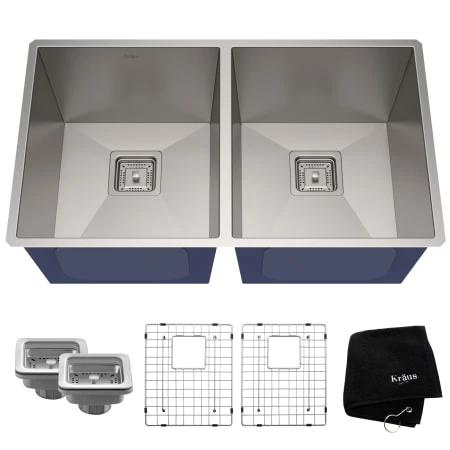 - Two square stainless steel basket strainer, two basin racks and dish towel included