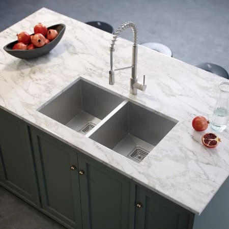 - Double basin sink with 50/50 split increases versatility