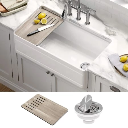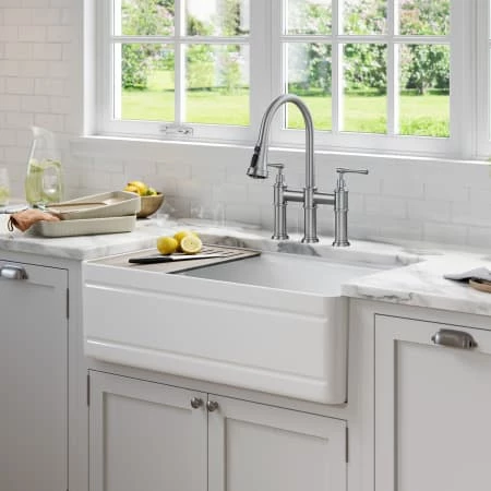 Handcrafted in Italy – the source of the world’s finest fireclay – the Turino™ Series exemplifies a stunning union of timeless design and modern functionality. This versatile farmhouse workstation sink features an integrated ledge that supports sliding accessories to streamline your workflow from meal-prep to clean-up. The sink comes with a heavy-duty cutting board so you can work right over the sink without taking up counter space. Featuring a beautifully pronounced apron front, the smart reversible design allows you to choose between a traditionally-inspired apron with decorative grooves, or a sleeker flat apron for more modern kitchens. Compression-molded from fine fireclay, Turino™ sinks are incredibly strong and impervious to impact and thermal shock. Kiln-fired at 2300°F, an extra-thick coating of enamel glaze creates a resilient high-gloss surface with unmatched resistance to scratches and stains. The ultra-fine material structure allows for a perfectly even application of glaze, resulting in a superior sink that is not susceptible to cracking or crazing. The glossy ultra-smooth surface resists stuck-on food and wipes clean with minimal effort. Color-stable material will not yellow or discolor over time. Designed with slim walls and tightly rounded corners, the large single bowl maximizes usable workspace in the sink to easily accommodate your biggest cookware. The gently sloped bottom is engineered to prevent water from pooling in the sink