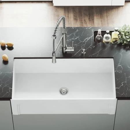 - Constructed of VIGO’s™ matte stone resin, a solid core material similar in composition to Corian maintaining non-porous, solid surface qualities
