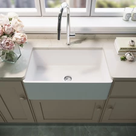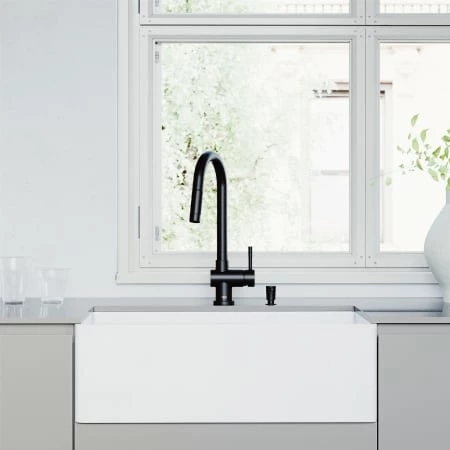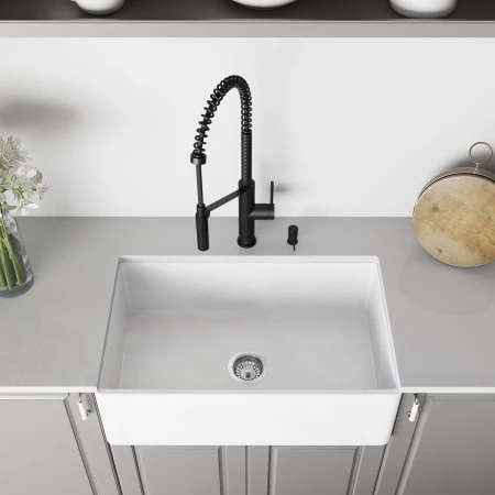 Everything you need to complete your modern kitchen is right at your fingertips with the VIGO 30″ Matte Stone™ Apron Front Farmhouse Kitchen Sink. This kitchen sink is crafted from VIGO’s signature Matte Stone™ composite for durability and resilience. Stain, chip, and scratch-resistant, VIGO Matte Stone™ sinks will remain a staple in your home for years to come. Deep enough to hold your largest pots and cookware, this sink has a smooth and flat apron front for a classic design. Enjoy beauty and precision with this timeless piece.