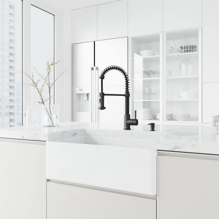 Modern in look and feel but classic in construction, this VIGO Matte Stone⢠farmhouse kitchen sink set is both trendy and timeless. The sink is made from VIGO’s proprietary Matte Stone⢠construction, a seamless, non-porous, solid-to-the-core composite that expertly resists scratches, discoloration, and impact. Exceptionally durable, this sink is sturdy and strong enough to withstand the test of time. Its 10mm radius curved corners provide for ideal functionality as well as easy cleaning. Inside the sink is a solid brass strainer, with a removable basket for convenience. To go with the sink is the bestselling VIGO Edison pull-down spray kitchen faucet. Built from solid brass construction, this faucet resists rust, corrosion, and tarnish. It has a 500,000 use-tested sedal ceramic disc cartridge, making it virtually leak and drip free, as well as a 30-inch extendable hose for easy use. The Edison features a Smart Handle easy installation, meaning it rotates just 90 degrees forward and back to prevent contact with delicate tile backsplashes. This allows the faucet to be installed in even the tightest of spaces. With dual functionality, this faucet offers either a powerful spray or an aerated flow, making it versatile for everyday use. A 1.8 gpm flow rate makes the VIGO Edison CEC (Title 20) compliant and eco-friendly with water conservation properties. Sitting beside the faucet is an in-counter 10 ounce soap dispenser, of which the reservoir can be refilled with hand soap, dish soap, or hand lotion. Enjoy high quality and style with this all-in-one kitchen sink set.