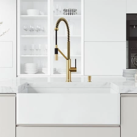 Classic design construction meets innovative technology with The Matte Stone Farmhouse Kitchen Sink Set with Livingston Faucet by VIGO. The sleek engineering of the faucet delivers exceptional multifunctionality. The construction of the sink adds a smooth texture to this exceptional kitchen sink set. VIGO’s exclusive finishes and materials reflect quality craftsmanship. Elegant in design and ergonomic in function, it seamlessly maximizes the form and functionality of your kitchen. The set is complete with a matching soap dispenser, a chrome strainer, and a strainer with a matching faucet finish.