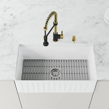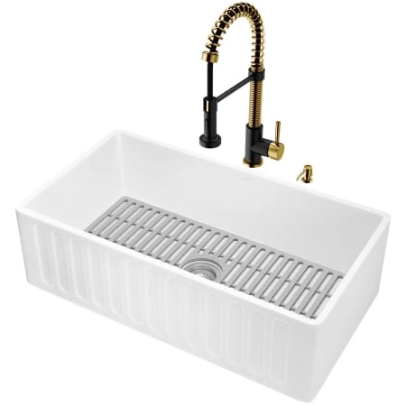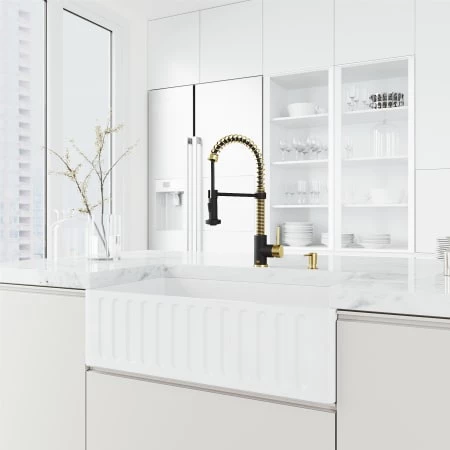 An attractive mix of finishes characterizes The Matte Stone Farmhouse Slotted Apron Front Kitchen Sink Set with Edison Faucet by VIGO. Taking inspiration from the industrial-chic design aesthetic, it features a faucet that takes notes from a commercial kitchen. This kitchen set’s beautifully engineered faucet flaunts smooth texture and handsome details. A mix of exclusive finishes adds bold color to its counterpart, the Matte Stone Farmhouse Kitchen Sink. This detail-oriented kitchen set brings art into your home. As a reflection of VIGO’s quality craftsmanship, it fuses form with function to provide exceptional performance.