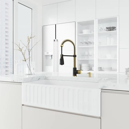 Classic design construction meets innovative technology with The Matte Stone Apron Front Farmhouse Kitchen Sink Set with Brant Faucet by VIGO. Taking inspiration from the industrial-chic design aesthetic, the faucet flaunts sleek coils and a pull-down hose. The construction of the sink adds a smooth texture to this exceptional kitchen sink set. VIGO’s exclusive finishes and materials reflect quality craftsmanship. Elegant in design and ergonomic in function, it seamlessly maximizes the form and functionality of your kitchen. The set is complete with a matching soap dispenser.