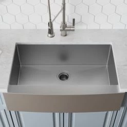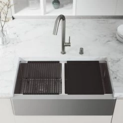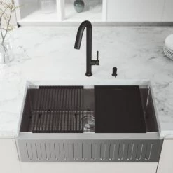 This multitasking sink is a handcrafted 33″ double bowl, flat Apron 304-series stainless steel, and 16-gauge model. The sink has an inner ledge on which a sleek black cutting board and roll-up silicone drying rack easily rest. Use them in the sink or slide them out and place on the countertop for additional space. A pull-down faucet and matching soap dispenser is also included. To complete this set are two protective stainless steel bottom grids and fitted stainless steel strainers.